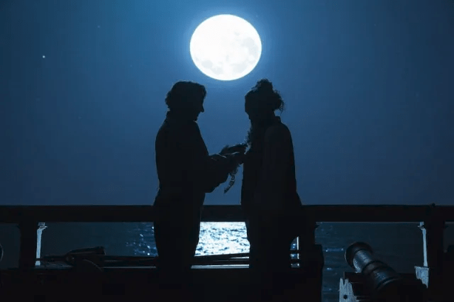 After attending a snooty French dinner party aboard another vessel (an excellent episode for so many reasons), Edward and Stede have a heartfelt conversation in the most romantic setting. Alone aboard the Revenge, with only the moon to illuminate them, Stede gently places the fine fabric into Edward’s pocket, and says “Look at that. You wear fine things well.”